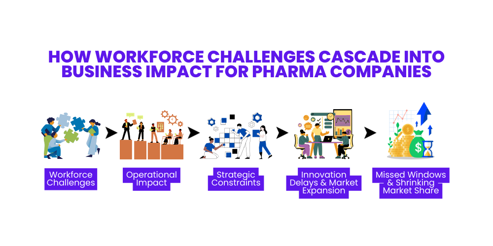 This operational reality leads to disruption in business continuity across safety, regulatory, and clinical functions. Time-to-productivity for new hires delays critical milestones. Vendor dependency limits control over quality and costs. When you encounter expertise gaps such as CAPA remediation, rare disease specialists, or GCC capability building, you face constraints from limited internal capacity and the availability of external vendors.